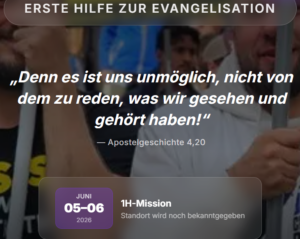 1H-Mission Wann 5. Juni 2026 - 6. Juni 2026 Ganztägig Zum Kalender hinzufügen ICS herunterladen Google Kalender iCalendar Office 365 Outlook Live Wo Bielefeld/Halle Halle, Bielefeld 1-Hilfe | Erste Hilfe für die Seele — 1H-Mission WER IST DABEI? WERDE LICHT STRASSENEVANGELISATION VIKTOR JANZEN SEELENRETTER DER WEG LUKAS REINER Jetzt anmelden: https://1h-mission.de/